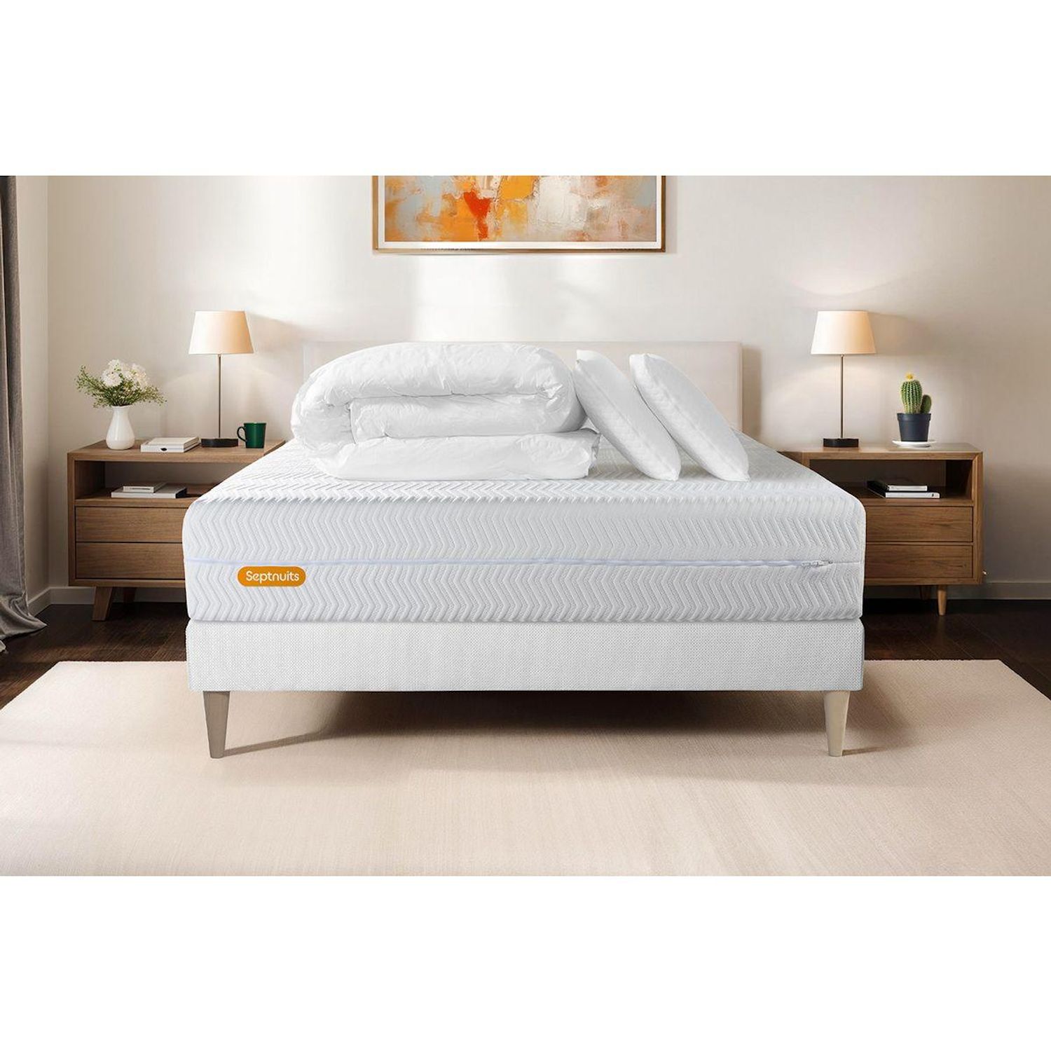 PACK Matelas + sommier Memo Bio Mousse à mémoire de forme 5 zones de confort Maxi épaisseur + Couette + 2 oreillers