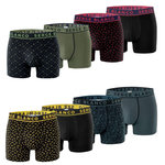 Sur ce lot de 8 boxers, 4 boxers présentent une couleur uni (noir, vert, gris) et 4 autres boxers présentent des motifs géométrique discret.