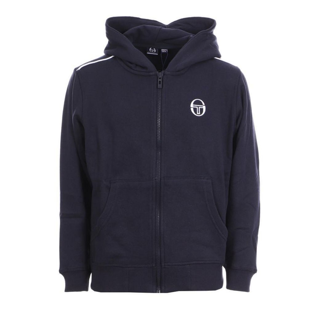 Optez vite pour le sweat de la marque Sergio Tacchini Manches longues Capuche Fermeture zippée 2 poches Logo brodé Coloris : Marine Composition : 80% coton , 20% polyester