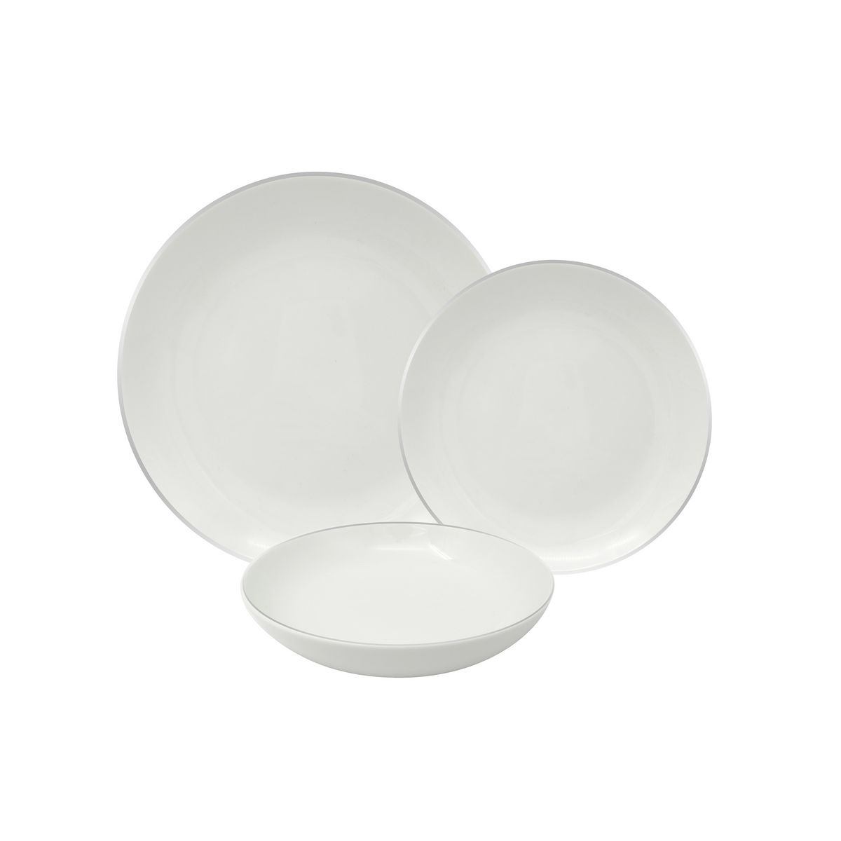 Service de table chic en porcelaine blanche et filet argent composé de 6 assiettes plates, 6 assiettes à dessert et 6 assiettes creuses. Non compatible lave-vaisselle et micro-ondes.