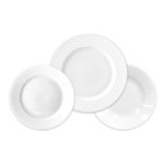 Découvrez ce service d'assiettes en porcelaine 18 pièces MAIA! Ce service est composé de 6 assiettes plates de 26,5 cm, 6 assiettes à dessert de 19 cm et de 6 assiettes creuses de 20 cm. Service compatible au lave-vaisselle.