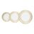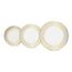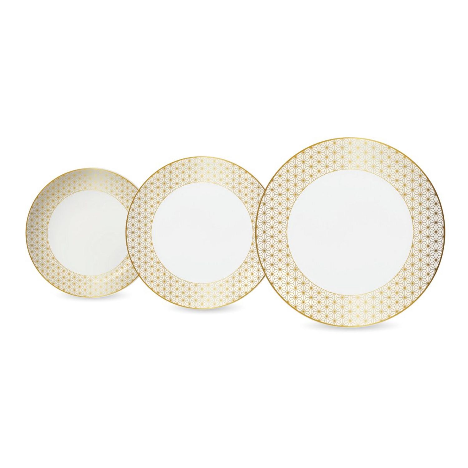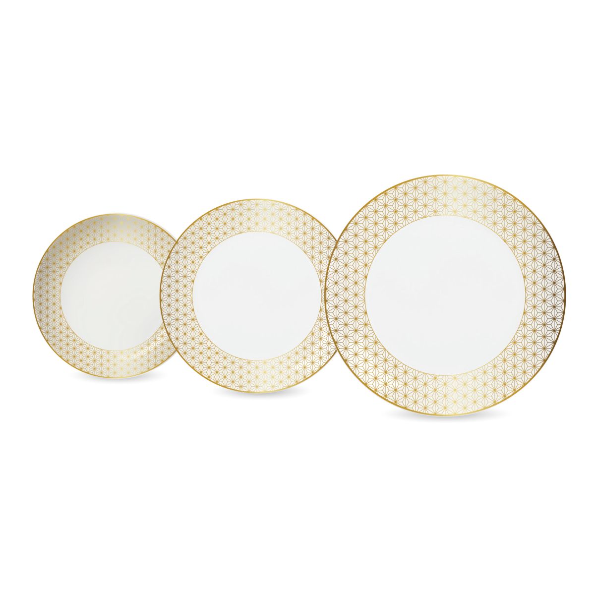 En savoir +Service 18 pièces MISATO en porcelaine doré composé de 6 assiettes plates 26,5cm + 6 assiettes plates 20cm + 6 assiettes à dessert 19 cm. Service compatible au lave-vaisselle.