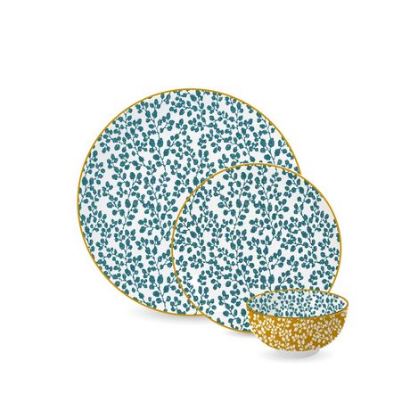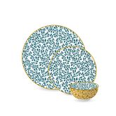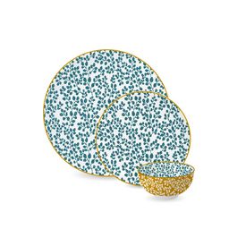 Service 18 pièces vert FEANA en porcelaine à décor tampon composée de 6 assiettes plates 26,5 cm + 6 assiettes à dessert 19cm + 6 coupelles 11,5 cm. Service compatible au lave-vaisselle.