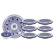 Découvrez ce service à couscous en terre cuite composé de 8 pièces : 6 tebsi 22 cm (assiettes) + 1 grand plat 37 cm + 1 bol 10 cm décorées de jolis motifs traditionnels bleus et blancs. Ce service sera parfait pour une belle présentation de vos plats lors des moments en famille ou entre amis. Non compatible lave-vaisselle.
