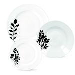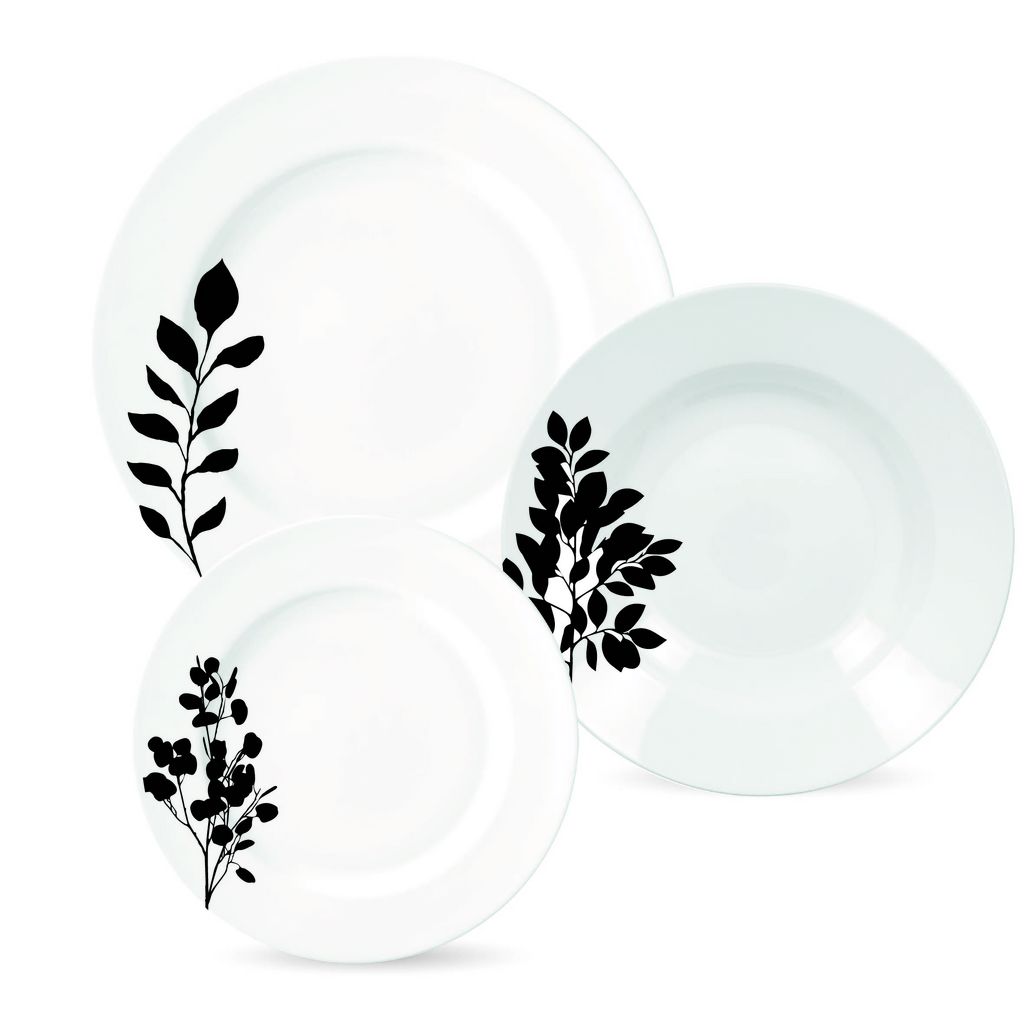 Egayez votre table avec ce service d'assiettes 18 pièces en porcelaine blanche avec motifs feuilles noires. Compatible lave-vaisselle et micro- ondes.
