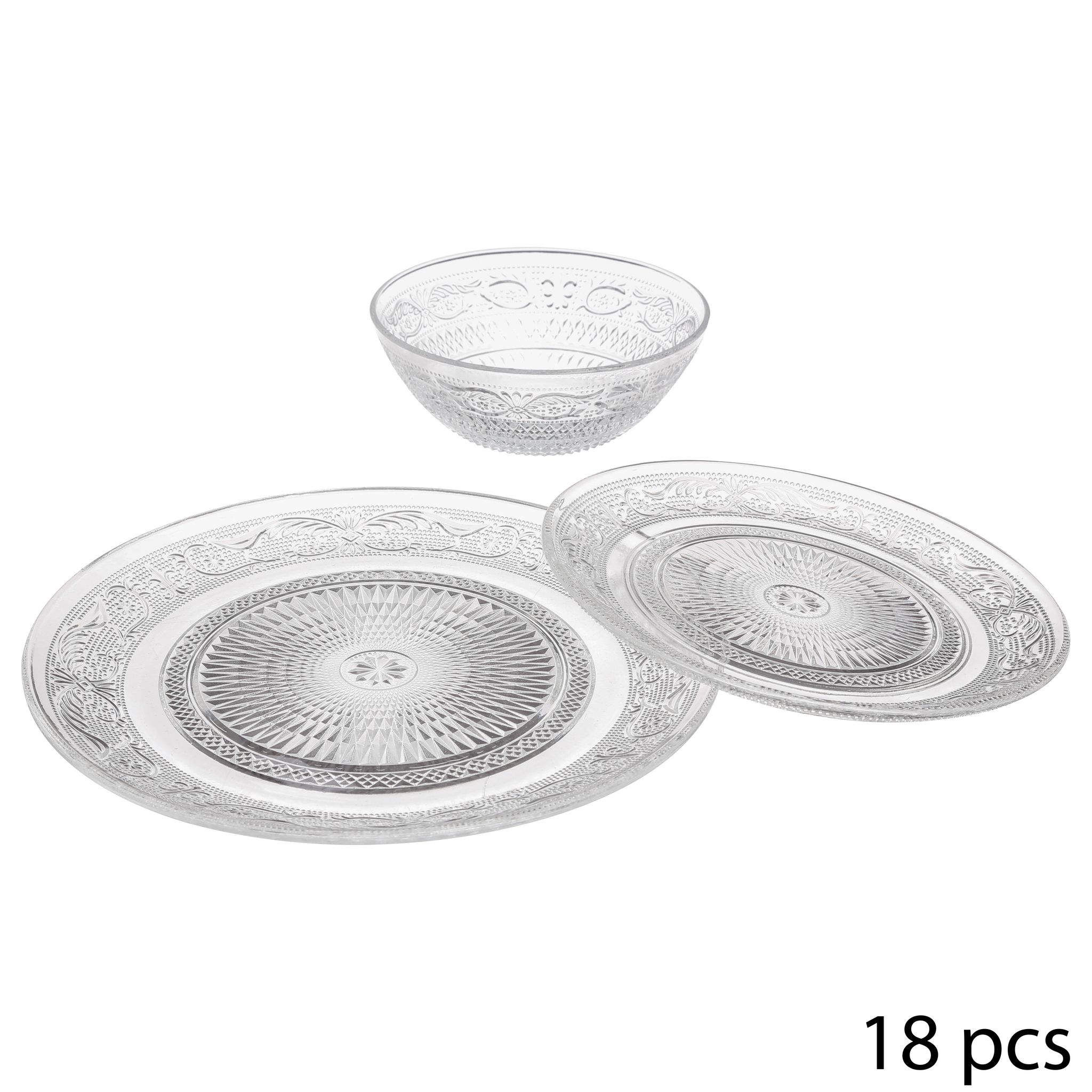 Service de Table 18 Pièces Renaissance Transparent. L'élégance du verre associée à des motifs délicats crée une table d'une beauté intemporelle. Compatible micro-ondes et lave-vaisselle pour une praticité absolue.