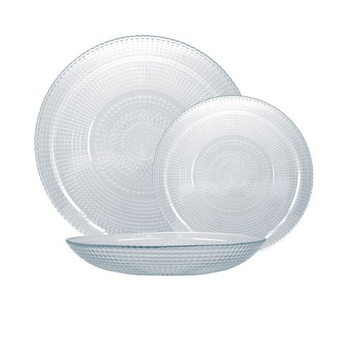 En savoir +La belle simplicité du verre translucide associée à un joli motif en relief... des assiettes qui associent en beauté tradition et modernité. Un service complet (6 assiettes plates, 6 assiettes à dessert et 6 assiettes creuses), faciles à vivre, pour tous les jours et toutes les tables. Tout ce qu'on aime !