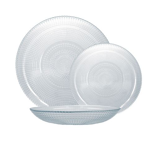 La belle simplicité du verre translucide associée à un joli motif en relief... des assiettes qui associent en beauté tradition et modernité. Un service complet (6 assiettes plates, 6 assiettes à dessert et 6 assiettes creuses), faciles à vivre, pour tous les jours et toutes les tables. Tout ce qu'on