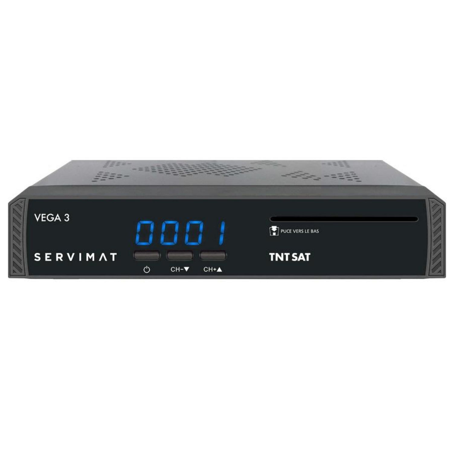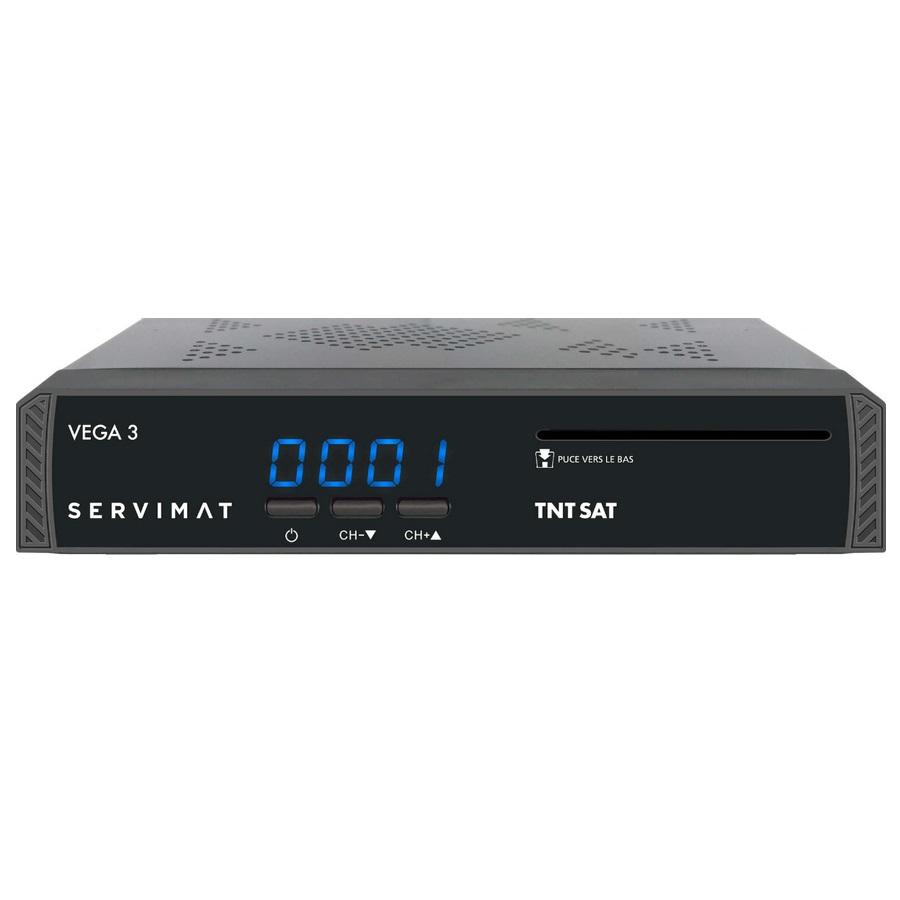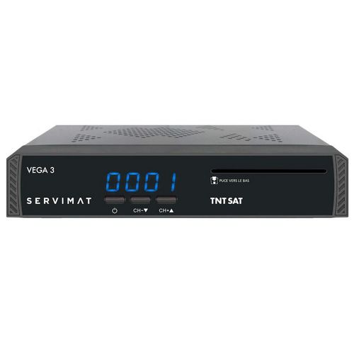 Servimat VEGA3 Avec le récepteur VEGA 3 de Servimat, appréciez pleinement les chaînes gratuites de la TNT en Haute Définition disponibles par satellite avec TNTSAT. Convivial et Fiable il est idéal pour Enregistrer et revoir vos programmes préférés. Le Déport des fonctions IR vous permettra de le dissimuler derrière le téléviseur pour le piloter sans le voir. Avec la Fonction Contrôle du Direct* pour pourrez stopper la vision d'un programme ou d'un film, vaquer à vos occupations et la reprendre plus tard comme avec un DVD.