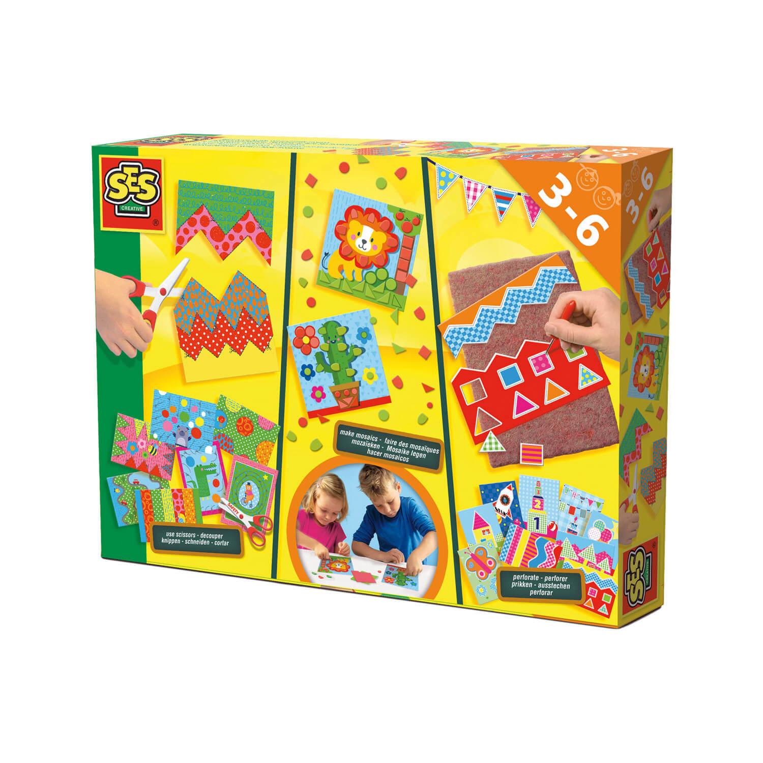 Coffret créatif : Perforer, découper et faire des mosaïquesContenu du coffret : - Une paire de ciseaux- 8 feuilles imprimées à découper- 2 planches mosaïques- 2 illustrations pour coller les mosaïques- Une planche pour la perforation- Un stylet perforation- 9 images à perforerConvient aux enfants de