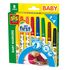 Boîte de 8 feutres Bébé. Superlavables. Capuchon sécurité. Pointes rondes, courtes, résistantes, bloquées (ne peut pas s'enfoncer). Age minimum : 24 mois