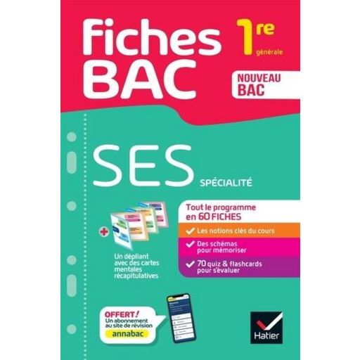 En savoir +Des fiches de révision conformes au programme de spécialité en SES 1re générale : un outil 100 % efficace pour réussir ses contrôles et progresser tout au long de l'année. L'essentiel du programme de SES 1re en fiches détachables Sur chaque thème du programme : - des fiches de cours, claires et visuelles - des quiz pour s'évaluer - des flashcards pour réactiver ses connaissances INCLUS : dans un dépliant détachable De grandes cartes mentales pour mieux mémoriser OFFERT : un abonnement au site de révision (Lien -> http : //www. annabac. com/) Pour accéder à des ressources complémentaires en SES et dans d'autres matières