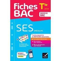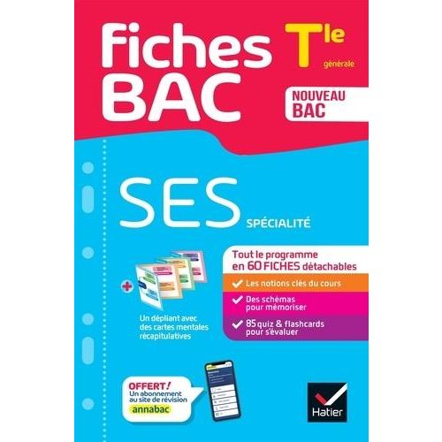 Des fiches de révision conformes au nouveau programme de SES Tle générale : un outil 100 % efficace pour réussir l'épreuve de spécialité au bac. L'essentiel du programme de SES Tle en fiches détachables Sur chaque thème du programme : - des fiches de cours, claires et visuelles - des quiz pour s'évaluer - des flashcards pour réactiver ses connaissances INCLUS : dans un dépliant détachable De grandes cartes mentales pour mieux mémoriser OFFERT : un abonnement au site de révision annabac Pour accéder à des ressources complémentaires en SES et dans d'autres matières : fiches, vidéos, quiz et sujets d'annales corrigés