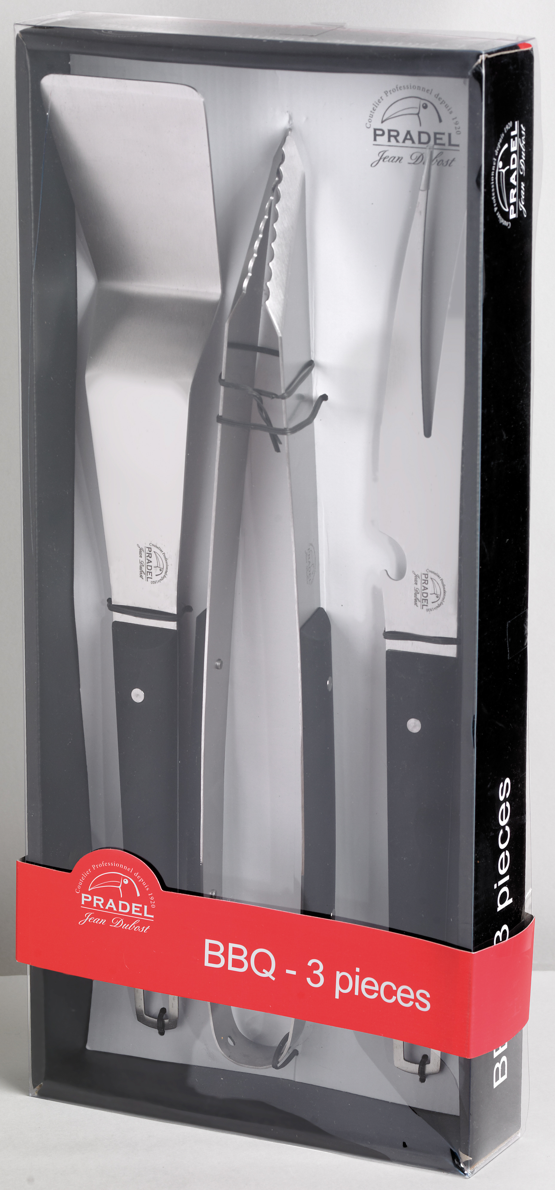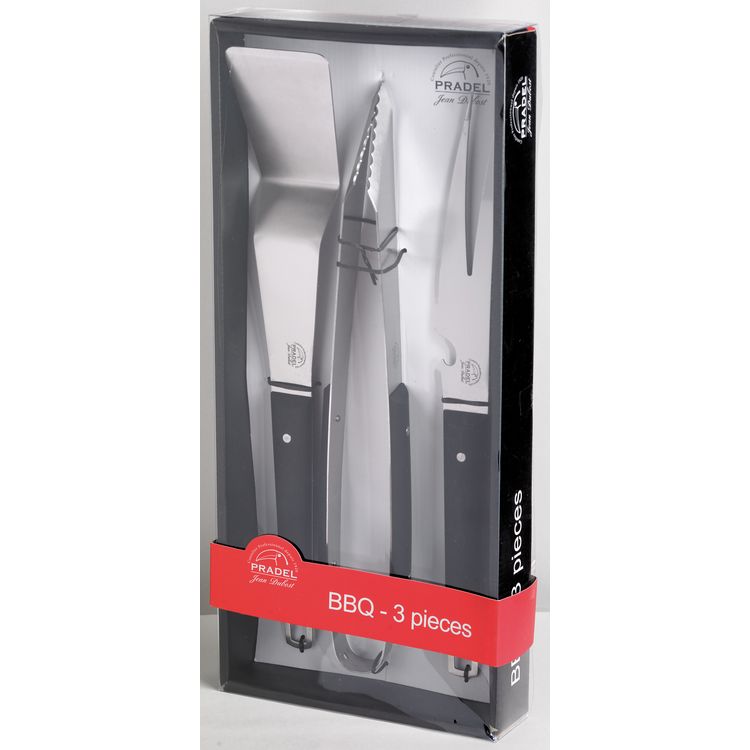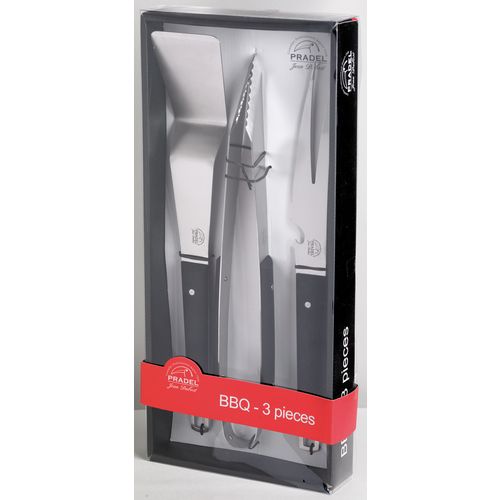 Ce set 3 pièces Barbecue est composé d'une pelle, d'une pince et d'un couteau fonction fourchette. Manche noir toucher soft. Finition en acier inox