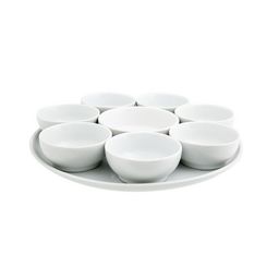 Aussi pratique que joli, un set apéritif en porcelaine blanche. Composé d'un plat de présentation et de 8 bols (dont 1 plus grand au centre) il est parfait pour présenter fruits secs, biscuits, olives, dés de fromage et rondelles de saucisson, tapenade et autres "tartinables".