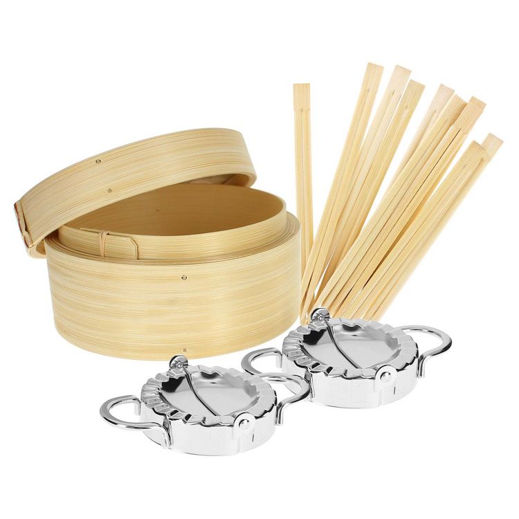 Cet ensemble vous permettra de réaliser et cuire facilement vos raviolis chinois Composition 1 cuit vapeur en bambou 20 cm de diamètre 10 paires de baguettes 2 moules à raviolis en inox