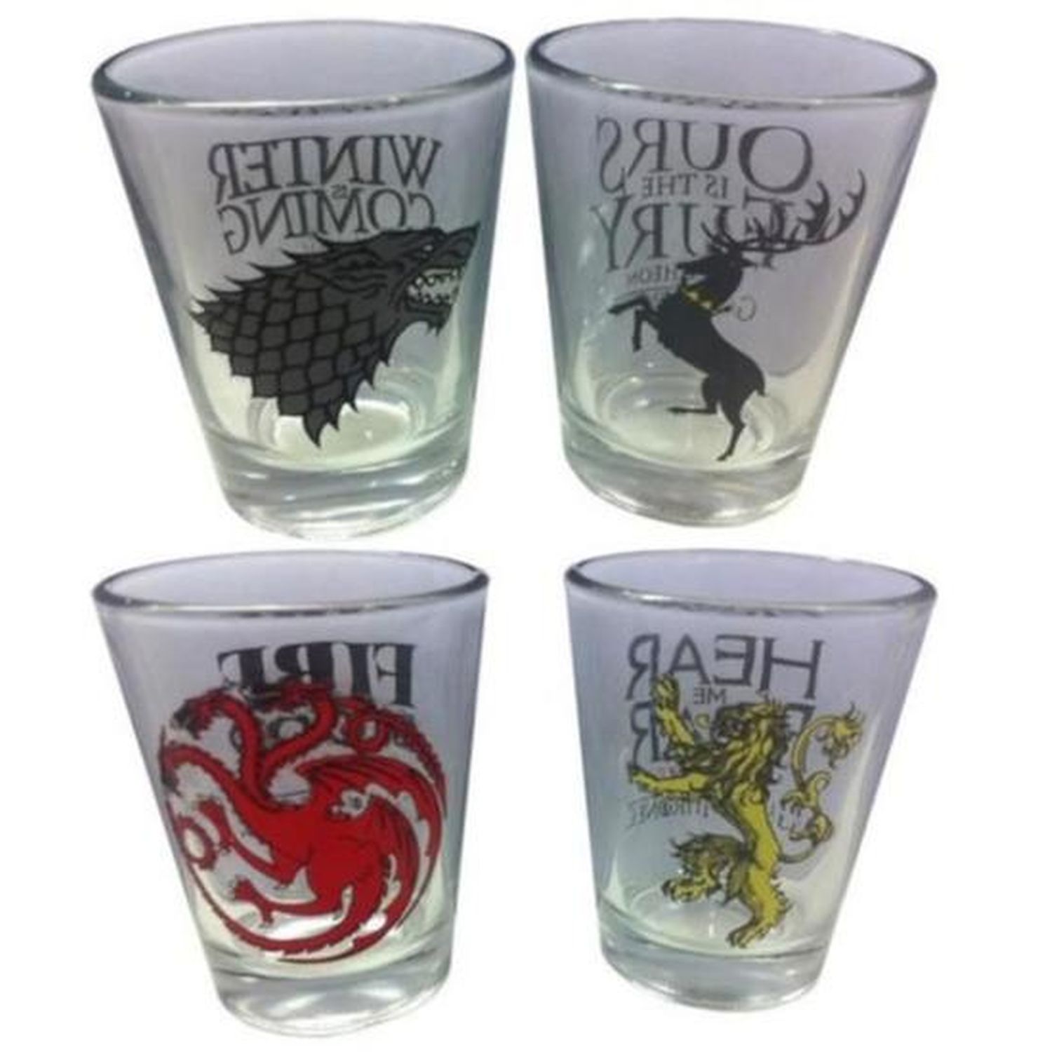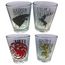 Lot de 4 verres à shoter en verre sérigraphié reproduisant le logo des maisons de la série Game Of Thrones. Contenance 50 ml.