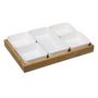 Set de 6 pièces comprenant un plateau en bambou et 5 compartiments en porcelaine blanche. Idéal pour la présentation de biscuits apéritifs ou amuses-bouches. Compatible lave-vaisselle (sauf plateau).