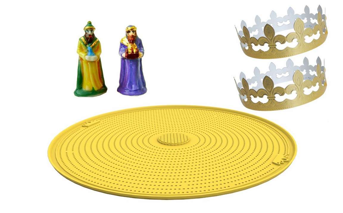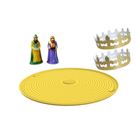 - 2 fèves - 2 plaques dorées - 2 couronnes - 1 plaque silicone perforée