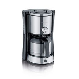 Severin KA4845 Cafetière filtre isotherme TypeSwitch Severin KA4845. De manipulation très simple, elle vous permettra de réaliser un très bon café. Elle dispose de la fonction AromaSwitch, pour que vous puissiez choisir la force de votre café (doux ou normal). Design de qualité supérieure avec applications inox. Verseuse isotherme inox avec couvercle de filtration et commande pratique à une main pour un maintien longue durée de la température. Préparation rapide et silencieuse du café grâce à une résistance atteignant 1 000 Watts. Filtre pivotant avec porte-filtre amovible 1 x 4. Système anti-goutte pour retirer sans risque la verseuse, même pendant la préparation du café. Indication du niveau d?eau bien visible sur les deux côtés. Compartiment intégré pour ranger le câble. Touche marche-arrêt avec voyant lumineux.