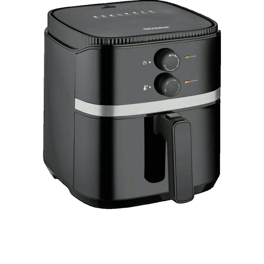 Découvrez la friteuse à air chaud Severin FR 2452, un appareil élégant en noir et argent, idéal pour une cuisine saine. Avec une capacité de 5 litres, elle permet de préparer jusqu'à 800 g de frites sans ajout d'huile, soit environ 3 à 4 personnes. La température est réglable de 80 à 200°C pour une