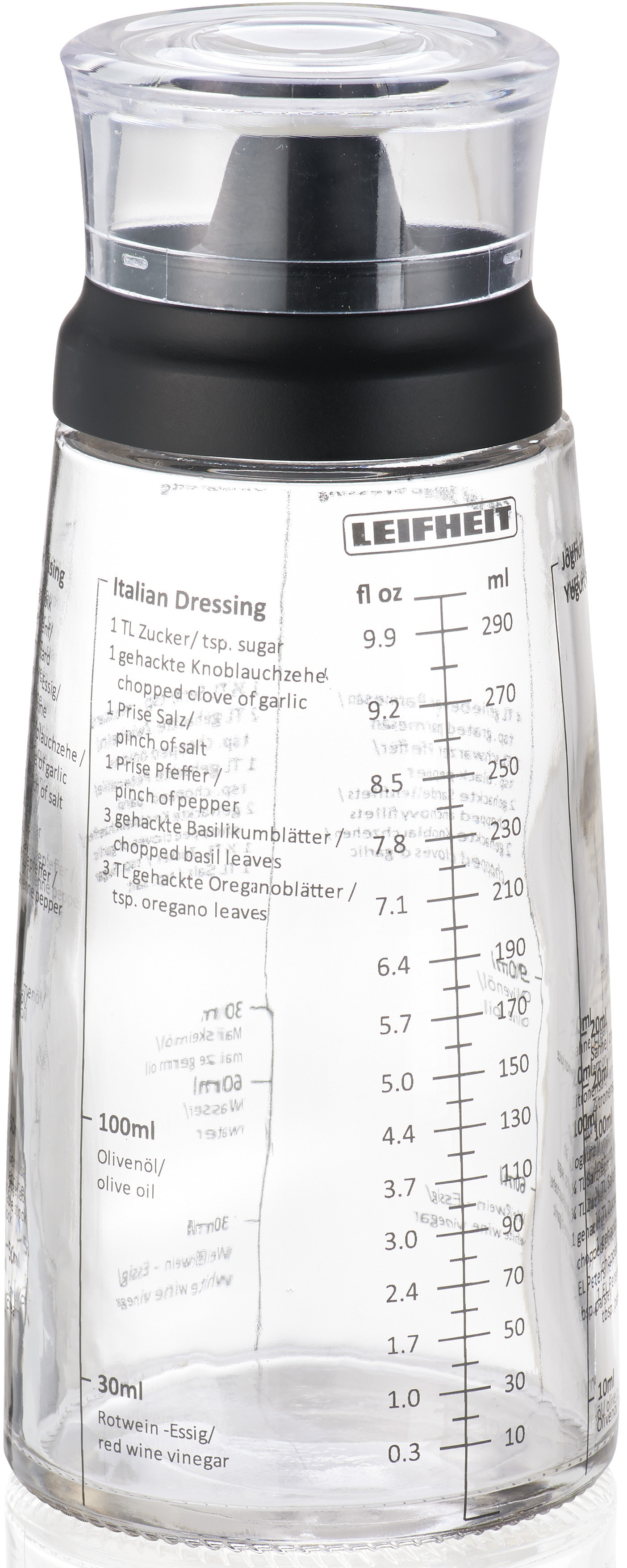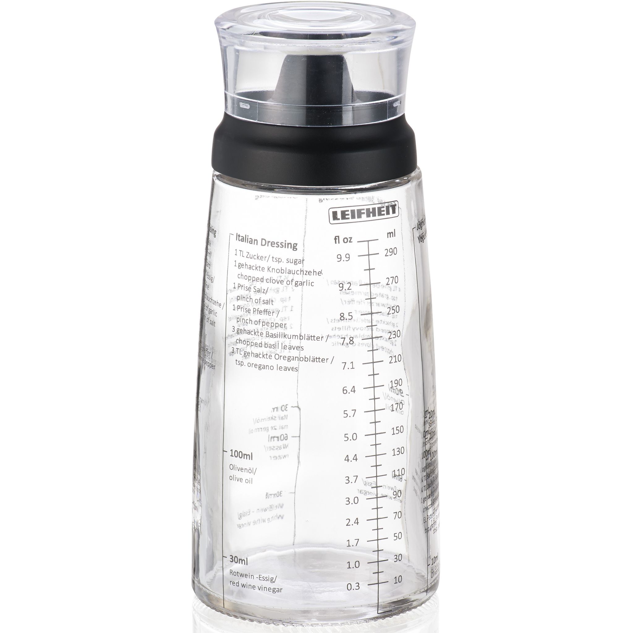 De bonnes sauces et des vinaigrettes raffinées révèlent les véritables talents d'un cuisinier. Le shaker à vinaigrette de Leifheit permet de préparer de délicieuses sauces salade. Et pas seulement : Le shaker aux formes harmonieuses est également très pratique d'utilisation. Car contrairement à la plupart des shakers à vinaigrette, il possède un bec verseur anti-goutte. Rien n'est versé à côté, la surface de travail et les mains restent propres. Une échelle graduée en ml et fl oz et des recettes pratiques sont imprimées sur le verre de haute qualité. Garantissant ainsi – sans gobelet doseur supplémentaire – toujours le bon mélange et des recettes à portée de main. La contenance de 300 ml suffit également pour de grandes quantités. Le verre et l'inscription sont adaptés au lave-vaisselle. Grâce au couvercle hermétique en plastique, le shaker peut être utilisé pour conserver la sauce salade.