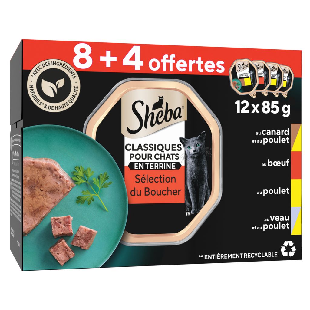 SHEBA Barquettes Classiques en Terrine Slection du Boucher 4 variétés pour Chat 85g 12x85g 8+4 offertes