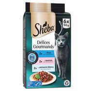 Les sachets fraîcheur pour chat adulte Sheba® Délices Gourmands sont disponibles en format 6x50g.