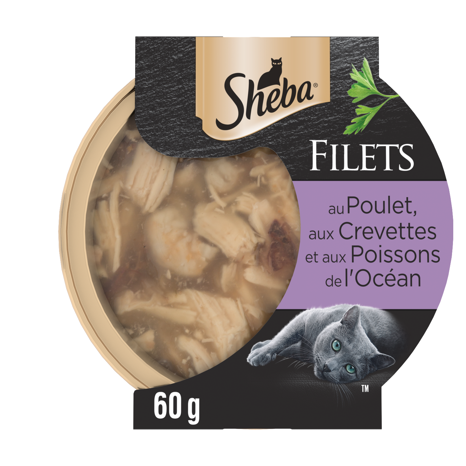 Les Sheba® FILETS au Poulet, aux Crevettes et aux Poissons de l'Océan sont disponibles en format 60g.