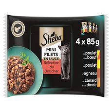 Les sachets fraîcheur pour chat adulte Sheba® Mini Filets Sélection du Boucher sont disponibles en format 4x85g.
