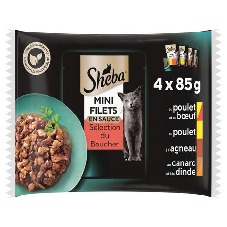 Aliment humide complet pour chats adultes - 4 variétés mini filets en sauce Sélection du Boucher (Au Poulet & Boeuf / Au Poulet / A l'Agneau / Au Canard & Dinde). Un somptueux mélange de tendres bouchées enrobées d'une sauce exquise. Une recette exceptionnelle avec des ingrédients naturels* et de qualité pour encore plus de complicité avec votre petit félin. Sans colorants artificiels, ni conservateurs. Chaque recette Mini Filets en sauce Sheba® est préparée avec des ingrédients de qualité, de tendres bouchées accompagnées d'une sauce esquise, et toujours fraîchement servie grâce à ses petites portions. Nourriture pour chat mise au point avec nos nutritionnistes et nos vétérinaires du centre de recherche WALTHAM® - Principale référence mondiale pour la nutrition et le bien-être des animaux de compagnie.