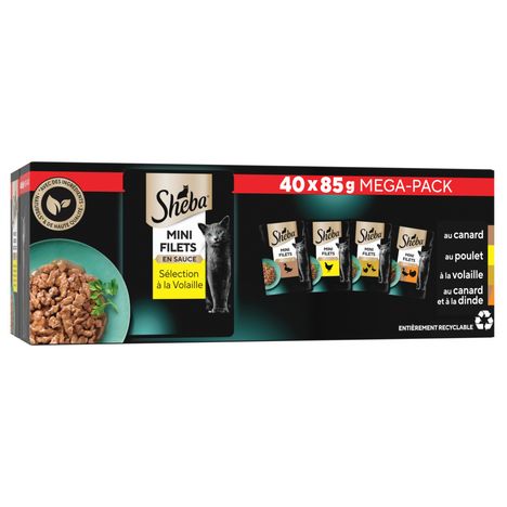 Les sachets fraîcheur pour chat adulte Sheba® Mini Filets Sélection à la Volaille sont disponibles en format EXTRA PACK de 40x85g.