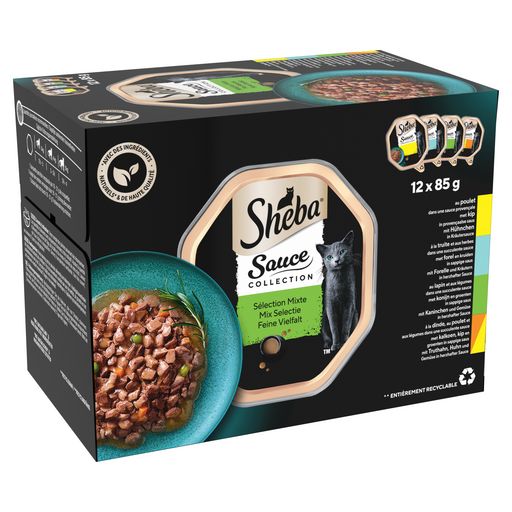 Les barquettes pour chat adulte Sheba® Sauce Collection Sélection Mixte sont disponibles au format 12x85g.
