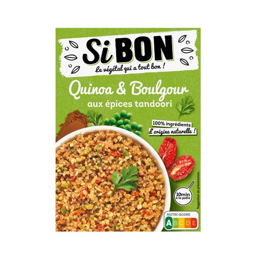 Ingrédients : Quinoa blanc et rouge précuits 43%, boulgour (BLÉ dur précuit concassé) 38%, tomates 4%, petits pois, oignons 3,2%, épices "tandoori" 2,5%, SÉSAME, sel, huile d'olive vierge extra, coriandre en feuille.Peut contenir du lait, soja, céleri et moutarde.