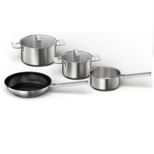 Siemens HZ9SE040 Batterie de cuisine 4 pièces acier inoxydable Siemens HZ9SE040. - Type d'article : Accessoires.Domaine d'application : Plaque de cuisson.Convient pour l'induction.Marmite Ø 18 (bas) / 20 cm (haut), capacité 3,5 l, avec couvercle en verre.Pot Ø 14 (bas) / 16 cm (haut), capacité 2 l,