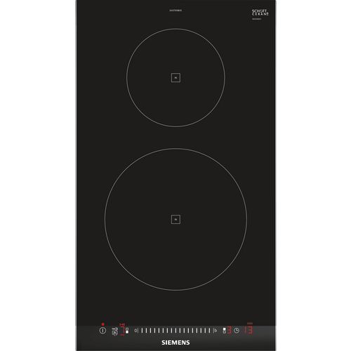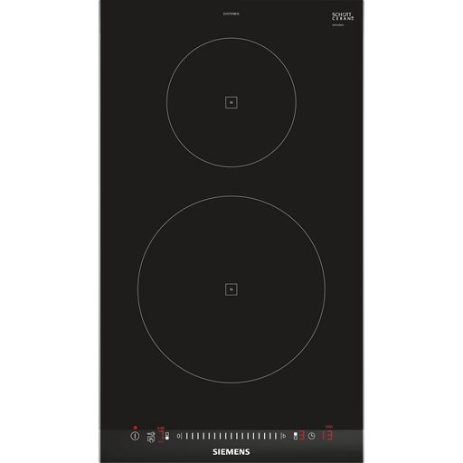 Siemens EH375FBB1E Table de cuisson Siemens EH375FBB1E.Ce Domino radiant rend la cuisine et le nettoyage plus facile.D'une largeur de 30 cm, il se combine très bien avec d'autres dominos.Fonction timer : la zone de cuisson se coupe une fois que le temps sélectionné arrive à échéance.Affichage digitalBandeau touchSlider.2 foyers inductionZones de cuisson : 1 x 145 mm, 1.4 kW (PowerBoost 2.2 kW), 1 x 210 mm, 2.2 kW (PowerBoost 3.7 kW).Fonction QuickStart : détection automatique des récipients sur la zone de cuissonFonction Re-Start : en cas d'arrêt brutal de la table, mémorisation de la température initiale pendant 4 secondesAffichage de la consommation énergétique17 positions de réglageTimer sur chaque foyerTémoin de chaleur résiduelle à 2 niveauxTouche nettoyage : possibilité de bloquer le bandeau de commande pendant 20 secondes afin de nettoyer la table en cas de débordement.