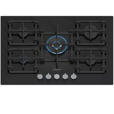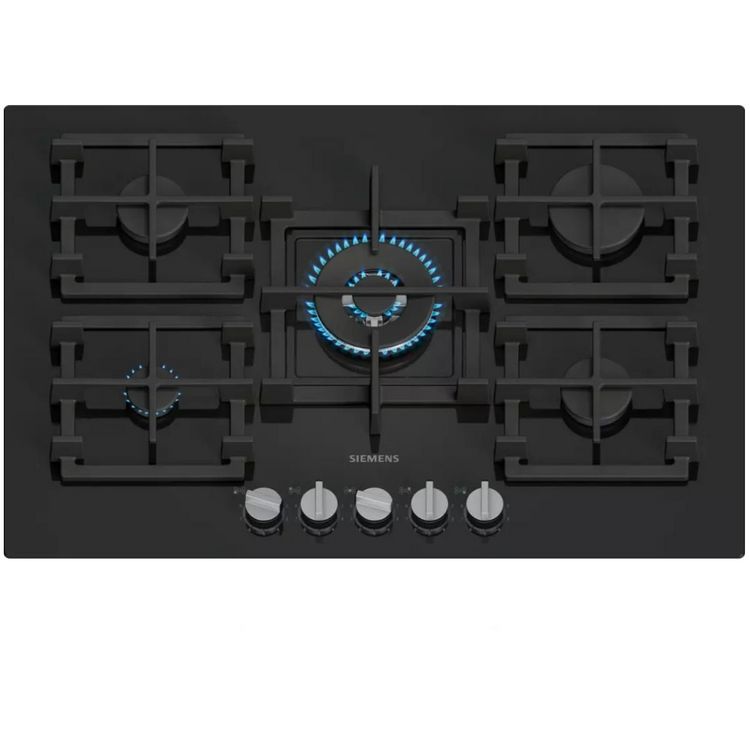 Siemens ER7A6RH40 Table de cuisson gaz en verre trempé iQ700 de Siemens ER7A6RH40 avec technologie stepFlame pour un contrôle précis de la flamme, contrôle intelligent de la hotte, boutons amovibles et supports de casseroles semi-continus pour un nettoyage facile.