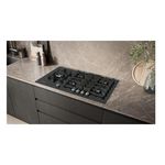 Table gaz en verre trempé avec technologie stepFlame pour un contrôle précis de la flamme, avec boutons amovibles et supports de casseroles semi-continus pour un nettoyage facile.