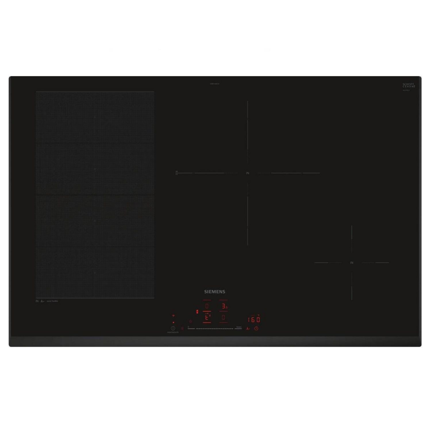 Siemens EX851HEC1F Table de cuisson induction sans cadre iQ700 Siemens EX851HEC1F. La plaque de cuisson intelligente flexInduction - pour une plus grande flexibilité lors de la cuisson et des possibilités infinies connectées par Home Connect. flexInduction : la zone de cuisson intelligente qui s'ada