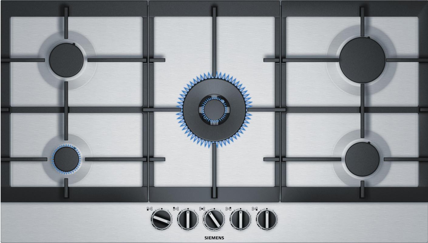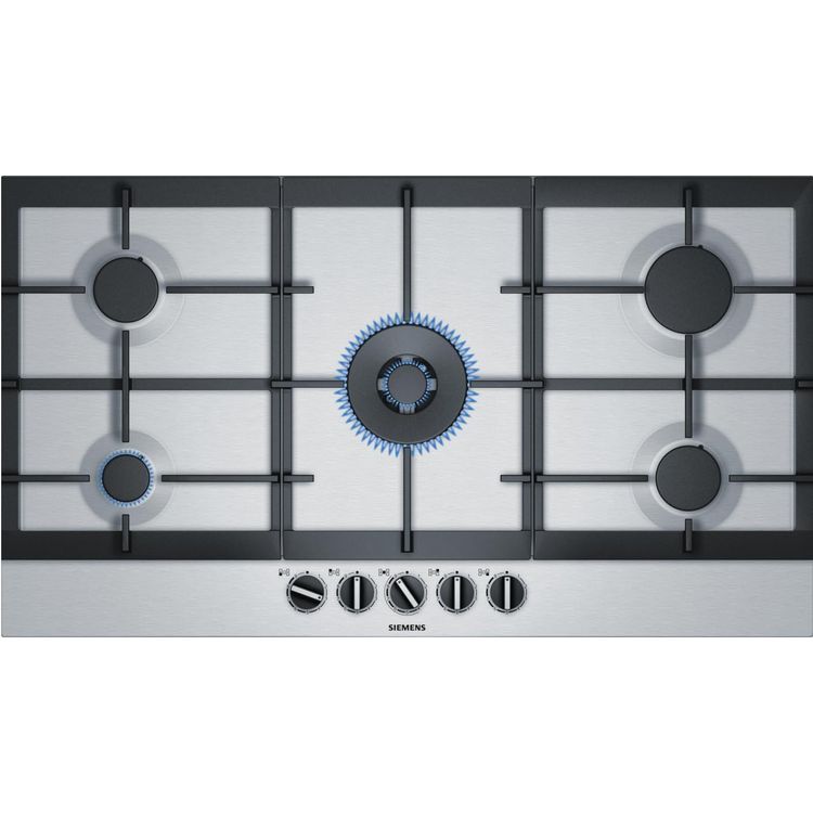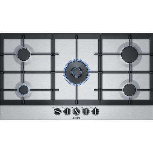 En savoir +Siemens EC9A5RB90 Table inox gaz iQ500 Siemes EC9A5RB90 avec la technologie stepFlame pour un contrôle précis de la flamme en 9 niveaux de puissance. Technologie StepFlame : contrôle précis de la chaleur en 9 niveaux de puissance. Wok double couronnes avec une puissance de 5 kW. Idéal pour la cuisson d'une large variété de plats même en grande quantité. Haute qualité des matériaux et de fabrication - supports en fonte. Usage confortable grâce à la grande qualité des boutons en épée. Table Siemens avec un design unique en acier inoxydable.Puissance :5 brûleurs.Avant gauche : Brûleur économique 1 kW.Arrière gauche : Brûleur normal 1.75 kW.Au centre : Wok 5 kW.Arrière droit : Brûleur grande puissance 3 kW.Avant droit : Brûleur normal 1.75 kW.Confort/Sécurité :Technologie stepFlame : 9 niveaux de puissance réglables avec précision.Allumage électrique une main.Sécurité gaz par thermocouple.Nettoyage facilité.Supports fonte.