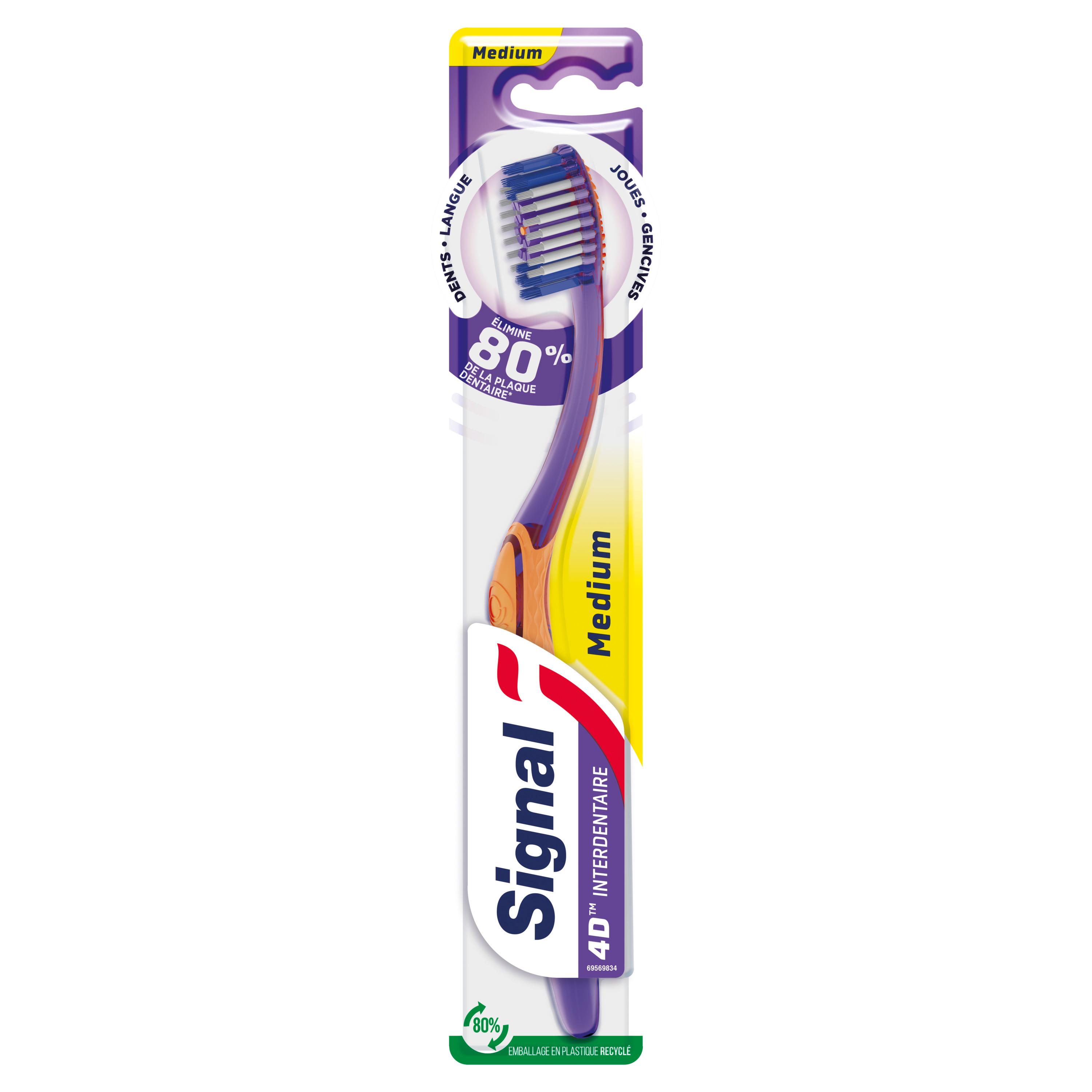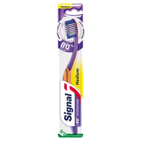La brosse à dents medium Signal 4 D Interdentaire nettoie 99 % des bactéries* et élimine 80 % de la plaque dentaire**. Les filaments sculptés délogent et éliminent la plaque dentaire tandis que les pointes de 0,01 mm multi-directionnelles offrent un nettoyage interdentaire en profondeur. Les 4 zones de poils multi-niveaux de cette brosse à dents procurent un nettoyage efficace, précis et sans effort. La brosse à dents Signal 4 D Interdentaire est également dotée d'une brosse langue et joues. De plus, son emballage contient 80 % de matière recyclée. En France, donnez une seconde vie à votre brosse à dents en la déposant dans le point de collecte TerraCycle le plus proche de chez vous. Chez Signal, nous pensons que votre sourire est l'expression de votre personnalité et de votre confiance en vous. Notre mission : améliorer la santé bucco-dentaire de tous, pour que chacun d'entre nous libère le pouvoir de son sourire. Signal accompagne les Français depuis 1961 pour leur transmettre les bons gestes, dès le plus jeune âge et démontrer l'importance d'un brossage deux fois par jour, matin et soir. Attentifs à la protection de la planète, nous prenons des mesures pour limiter l'impact environnemental de nos produits. En partenariat avec TerraCycle®, nous avons lancé un programme de recyclage gratuit, pour donner une seconde vie à vos brosses à dents et vos tubes de dentifrice. Avec Signal, chaque sourire compte ! *Test laboratoire. **Test laboratoire dents, langue, joues et gencives.