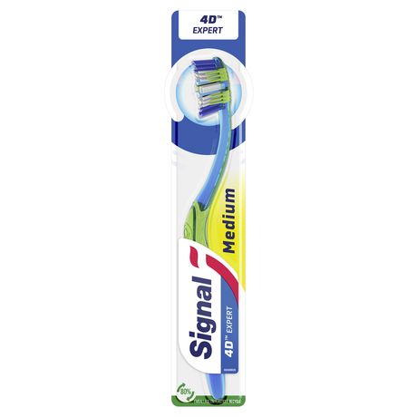 La brosse à dents medium Signal 4 D Expert nettoie 99 % des bactéries*. Les filaments sculptés délogent et éliminent la plaque dentaire tandis que les pointes effilées et multi-angles permettent d'atteindre les zones difficiles d'accès. Les 4 zones de poils multi-angles offrent un nettoyage efficace, précis et sans effort. La brosse à dents Signal 4 D Expert est également dotée d'une brosse langue et joues. De plus, son emballage contient 80 % de plastique recyclé. La FDI reconnait qu'un brossage deux fois par jour avec une brosse à dents comme Signal 4 D contribue à maintenir une bonne hygiène bucco-dentaire. En France, donnez une seconde vie à votre brosse à dents en la déposant dans le point de collecte TerraCycle le plus proche de chez vous. Chez Signal, nous pensons que votre sourire est l'expression de votre personnalité et de votre confiance en vous. Notre mission : améliorer la santé bucco-dentaire de tous, pour que chacun d'entre nous libère le pouvoir de son sourire. Signal accompagne les Français depuis 1961 pour leur transmettre les bons gestes, dès le plus jeune âge et démontrer l'importance d'un brossage deux fois par jour, matin et soir. Attentifs à la protection de la planète, nous prenons des mesures pour limiter l'impact environnemental de nos produits. En partenariat avec TerraCycle®, nous avons lancé un programme de recyclage gratuit, pour donner une seconde vie à vos brosses à dents et vos tubes de dentifrice. Avec Signal, chaque sourire compte ! *Test laboratoire.