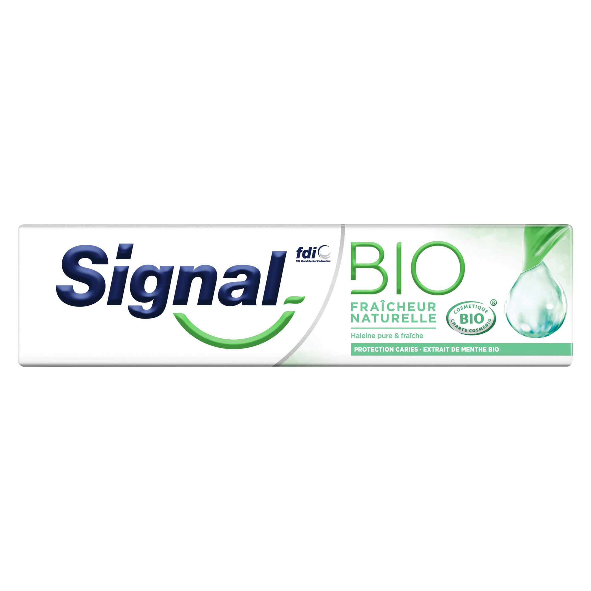 L'expertise des dentifrices Signal, maintenant en Bio ! Le dentifrice Signal Bio Fraîcheur Naturelle contient des extraits de menthe bio et d'huiles essentielles d'eucalyptus bio pour vous offrir une fraîcheur naturelle longue durée. Enrichi en zinc minéral d'origine naturelle, ce dentifrice bio aide à lutter contre les bactéries et procure une action anti-plaque pour des dents et des gencives naturellement protégées. Sa formule enrichie en fluor renforce les dents et lutte contre l'apparition des caries, tout en respectant l'émail. Résultat : une haleine fraîche et des dents saines naturellement. Composé à 100 % d'ingrédients d'origine naturelle, le dentifrice Signal Fraîcheur Naturelle est certifié Bio Cosmos Organic par Ecocert.
