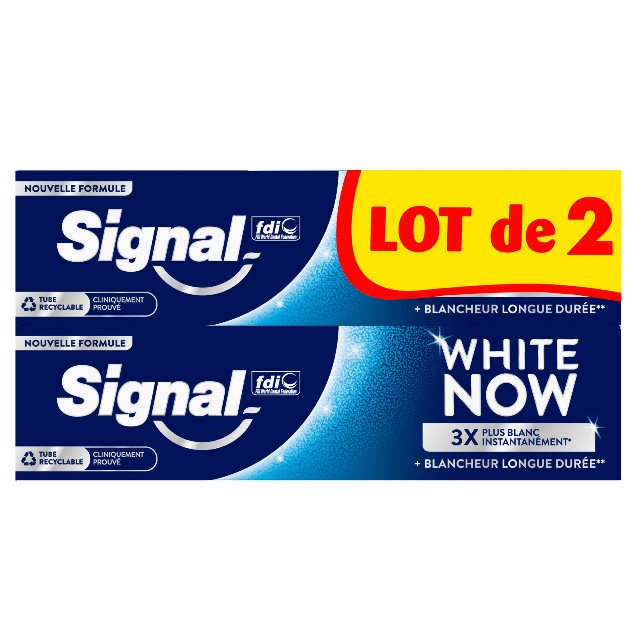 La nouvelle formule du dentifrice Signal White Now Original combine deux technologies cliniquement prouvées : la technologie White-Correct + avec des pigments bleu-saphir et verts qui corrigent la couleur de vos dents, pour un sourire 3 x plus blanc instantanément¹ et la technologie White-Infinity avec des minéraux d'origine naturelle qui nettoient les dents et aident à retirer les taches progressivement pour une blancheur longue durée². Cette formule améliorée comprend 94 % d'ingrédients d'origine naturelle. Cliniquement prouvé et respectueux de l'émail, White Now Original contient des ingrédients blancheur instantanée non abrasifs et du fluor pour un usage quotidien. De plus, le carton et le tube souple de ce dentifrice composé de 22 % de plastique recyclé sont maintenant entièrement recyclables. Chez Signal, nous pensons que votre sourire est l'expression de votre personnalité et de votre confiance en vous. Notre mission : améliorer la santé bucco-dentaire de tous, pour que chacun d'entre nous libère le pouvoir de son sourire. Signal accompagne les Français depuis 1961 pour leur transmettre les bons gestes, dès le plus jeune âge et démontrer l'importance d'un brossage 2 fois par jour, matin et soir. Attentifs à la protection de la planète, nous prenons des mesures pour limiter l'impact environnemental de nos produits. ¹Cliniquement prouvé sur 58 personnes comparé à un dentifrice fluoré standard. Effet blancheur instantanée optique et temporaire. ²Testé cliniquement sur 58 personnes avec un brossage deux fois par jour pendant 4 semaines.