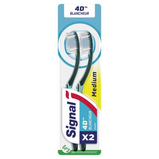 La brosse à dents medium Signal 4 D Blancheur en lot de 2 nettoie 99 % des bactéries*. Les filaments spéciaux en spirale de cette brosse à dents sont efficaces sur 7 types de taches** tandis que les filaments en forme de diamants polissent l'émail en douceur. Les 4 zones de poils multi-angles offrent un nettoyage efficace, précis et sans effort. La brosse à dents Signal 4 D Blancheur est également dotée d'une brosse langue et joues. De plus, son emballage contient 80 % de plastique recyclé. La FDI reconnait qu'un brossage deux fois par jour avec une brosse à dents comme Signal 4 D contribue à maintenir une bonne hygiène bucco-dentaire. En France, donnez une seconde vie à votre brosse à dents en la déposant dans le point de collecte TerraCycle le plus proche de chez vous. Chez Signal, nous pensons que votre sourire est l'expression de votre personnalité et de votre confiance en vous. Notre mission : améliorer la santé bucco-dentaire de tous, pour que chacun d'entre nous libère le pouvoir de son sourire. Signal accompagne les Français depuis 1961 pour leur transmettre les bons gestes, dès le plus jeune âge et démontrer l'importance d'un brossage deux fois par jour, matin et soir. Attentifs à la protection de la planète, nous prenons des mesures pour limiter l'impact environnemental de nos produits. En partenariat avec TerraCycle®, nous avons lancé un programme de recyclage gratuit, pour donner une seconde vie à vos brosses à dents et vos tubes de dentifrice. Avec Signal, chaque sourire compte ! *Test laboratoire. *Test laboratoire après 2 jours et 2 brossages quotidiens. Tache de thé, café, tabac, vin rouge, soja, grenade et curcuma.
