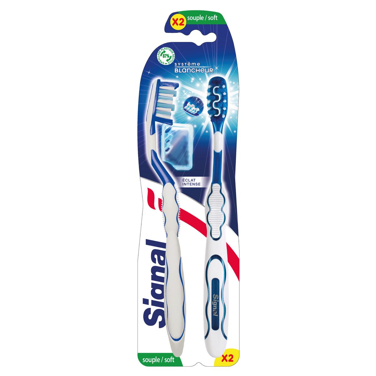 La brosse à dents souple Signal Système Blancheur Éclat Intense Souple en lot de 2 est votre allié blancheur pour un sourire resplendissant.