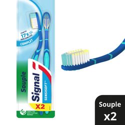 Les brosses à dents Signal Sensisoft souples sont dédiées à la douceur du brossage et au soin des gencives. La gamme est composée de 3 brosses à dents : Complet, Charbon et Sensibilité. Les brosses à dents Sensisoft ont des pointes 17x plus fines*, un cou flexible doté de trois angles pour faciliter l'accès aux dents du fond et une tête étudiée pour une couverture de brossage efficace et précise. L'assemblage de pointes fines colorées de 0,01 mm et de pointes arrondies de la brosse à dents Sensisoft Complet permet un nettoyage efficace et en douceur des dents et des gencives. La brosse à dents Sensisoft Complet élimine 99 % de la plaque dentaire**. Cette brosse à dents est disponible en lot de 2. Chez Signal, nous pensons que votre sourire est l'expression de votre personnalité et de votre confiance en vous. Notre mission : la prévention et l'hygiène bucco-dentaire pour que chacun d'entre nous libère le pouvoir de son sourire. Nous prenons des mesures pour limiter l'impact environnemental de nos produits. La brosse à dents est recyclable en participant au programme de recyclage TerraCycle®. Il suffit de la déposer dans le point de collecte le plus proche de chez vous. Rendez-vous sur www.terracycle.com/signal. Emballage fabriqué avec 80 % de plastique recyclé. Pour rappel, Signal recommande un brossage deux fois par jour, une brosse à dents neuve tous les trois mois, et une visite chez le dentiste deux fois par an. *Comparées à une brosse à dents souple Signal Integral 8. **Test laboratoire mesurant l'élimination des bactéries de la plaque.
