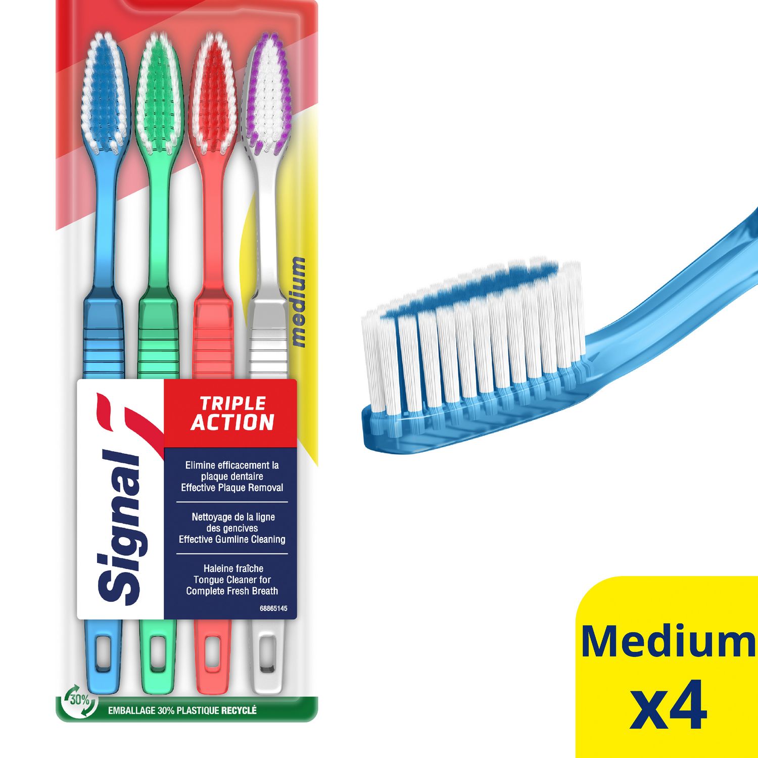 L’essentiel du brossage avec le lot de 4 brosses à dents Signal Triple Action medium : action anti-plaque, nettoyage de la ligne des gencives et haleine fraîche.