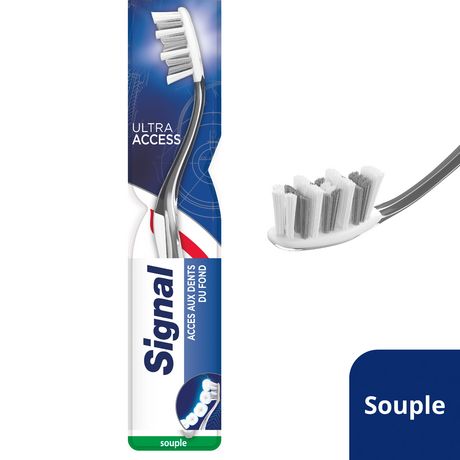 La brosse à dents souple Signal Ultra Access atteint avec précision les dents du fond où se forment souvent les caries. Grâce à son long cou ultra-fin, elle nettoie l'intégralité des dents, même les endroits difficiles d'accès. Cette brosse à dents est dotée d'une tête compacte pour un brossage optimal, même entre les dents. Inspirée du matériel des dentistes, c'est la première brosse à dents avec un cœur en métal ! Également disponible en format medium, vous pouvez la recycler grâce au programme gratuit Signal TerraCycle® en la déposant dans votre point de collecte le plus proche.