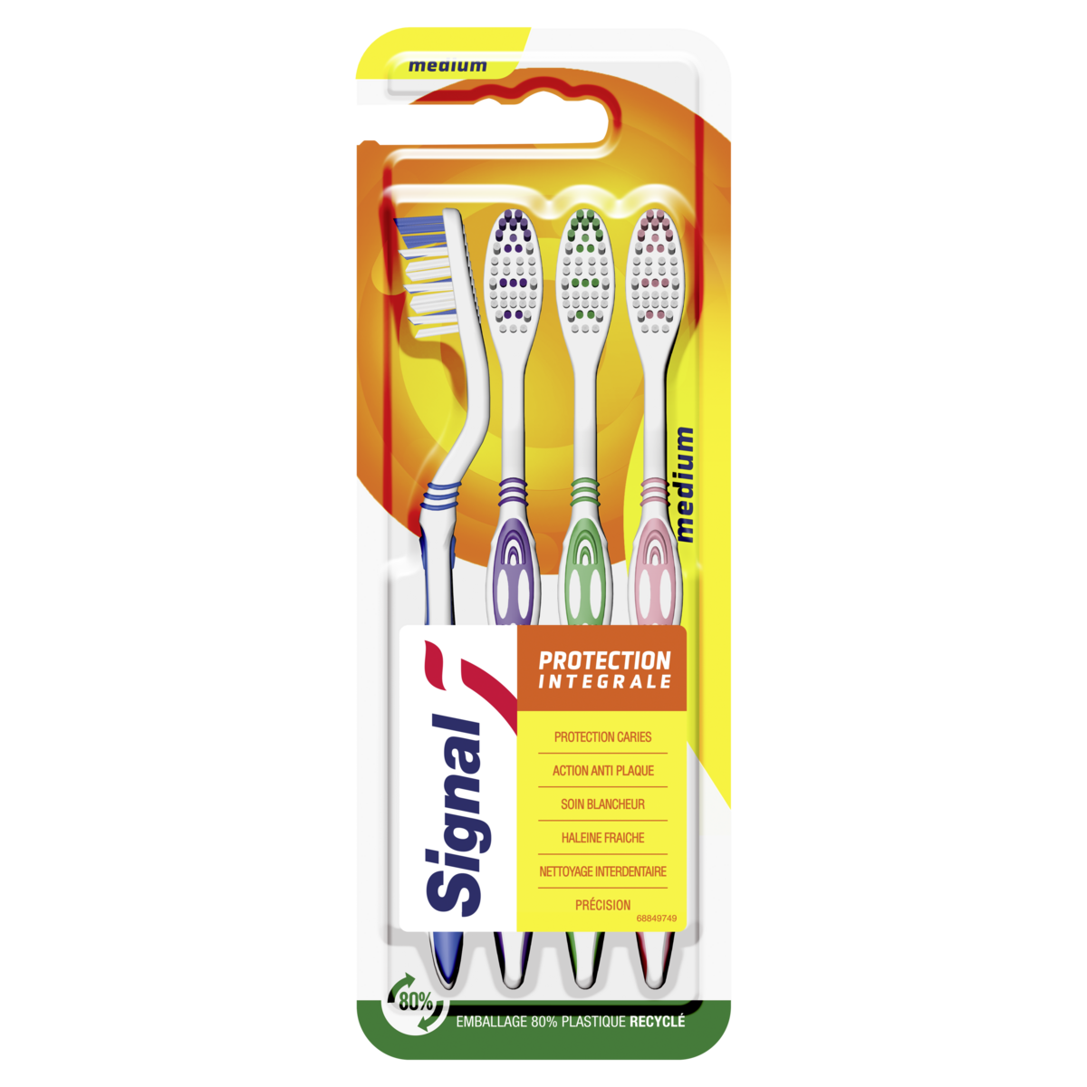 La brosse à dents médium Signal Protection Intégrale, en lot de 4, offre 6 actions nettoyantes pour vous aider à protéger vos dents des caries, des taches et de la mauvaise haleine.